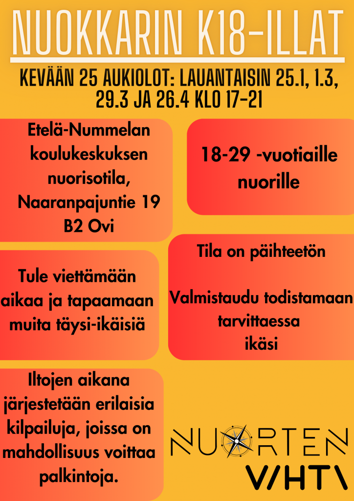 Lauantaina 25.1.2025 tila on auki normaalisti 4.-6.lk nuorille ja illalla 17-21 vietetään vuoden ensimmäistä K18 Nuokkari-iltaa. Tällöin tilalle ovat tervetulleita kaikki 18-29-vuotiaat vihtiläiset nuoret.