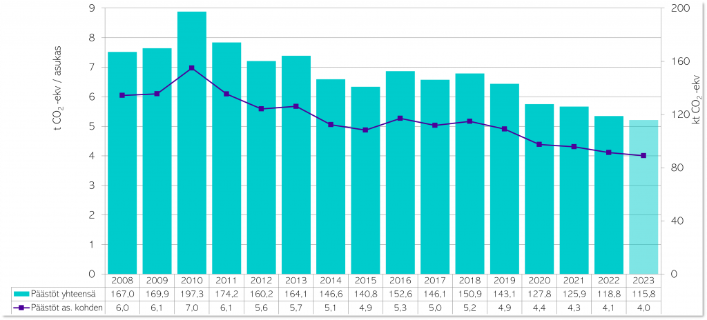 Vihdin päästöt asukasta kohden (4,1 t CO2-ekv) olivat pienemmät kuin kaikissa CO2-raportissa mukana olevissa kunnissa keskimäärin (4,9 t CO2-ekv) vuonna 2022. Tulee kuitenkin muistaa, että raportissa ei ole huomioitu muualla kuin kunnan alueella aiheutuneita päästöjä.