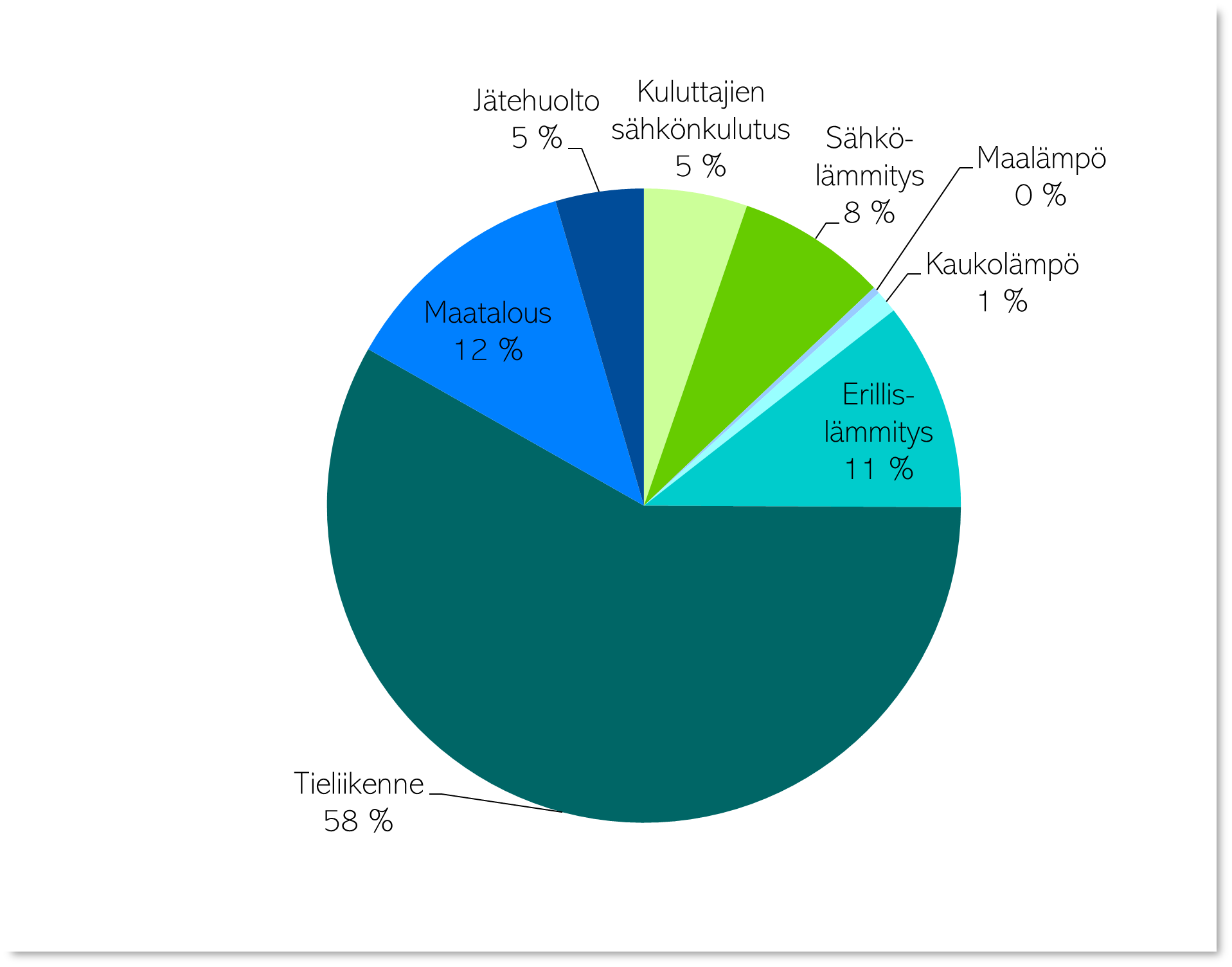 Vuonna 2022 suurin osa kunnan päästöistä muodostui tieliikenteestä (58 %, 69,1 kt CO2-ekv), josta 85 prosenttia oli kauttakulkuliikennettä. Seuraavaksi suurin päästölähde oli kiinteistöjen lämmitys (20 %, 23,5 kt CO2-ekv), josta suurimmat päästöt tulivat erillislämmityksestä (12,6 kt CO2-ekv). Erillislämmityksellä tarkoitetaan muuta kuin kaukolämpöä tai lämmityssähköä, esimerkiksi poltettavaa öljyä, kaasua ja puuta.