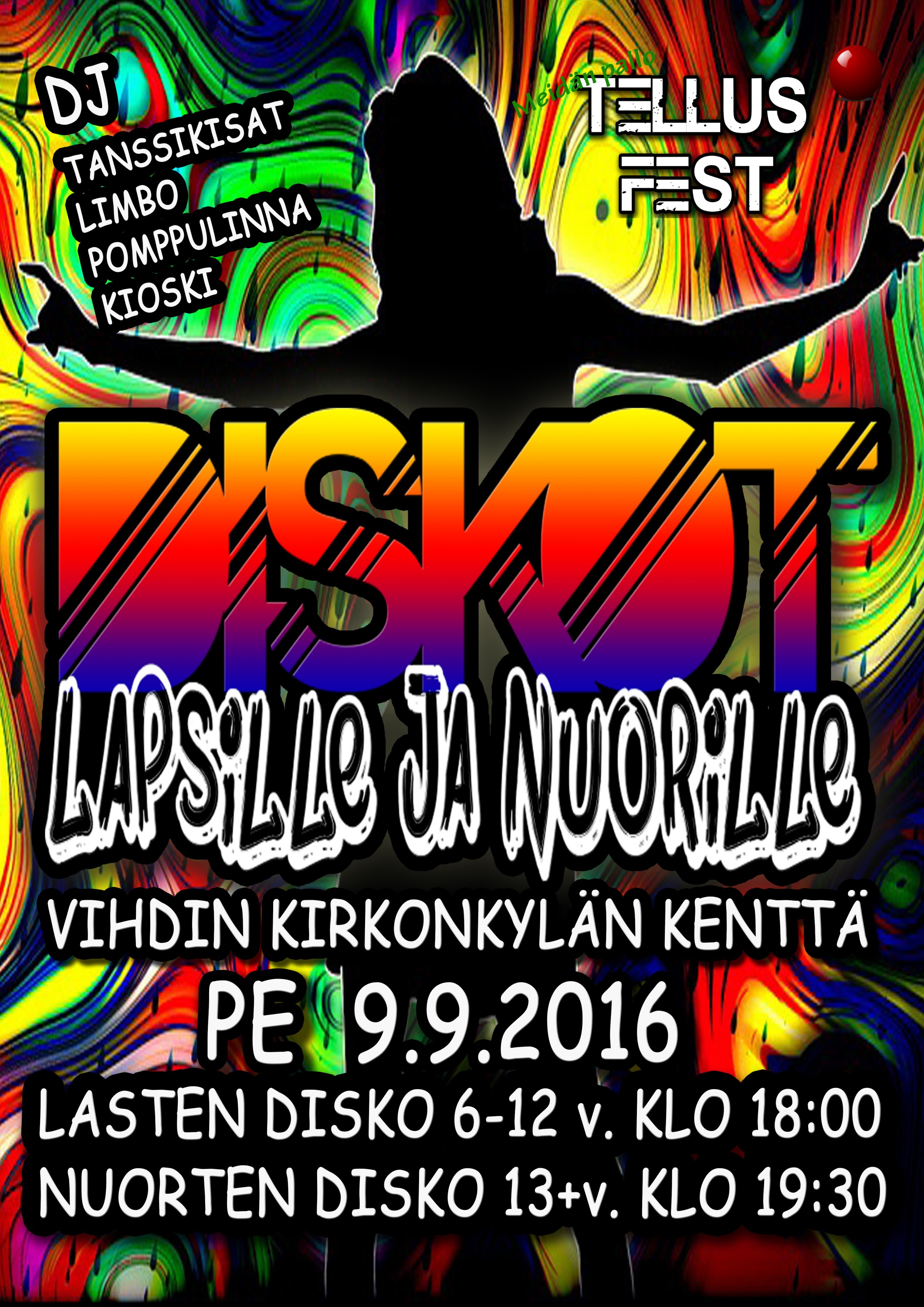 Tellus Fest -diskot lapsille ja nuorille kirkonkylän hiekkakentän tapahtumateltassa perjantaina 9.9.2016.