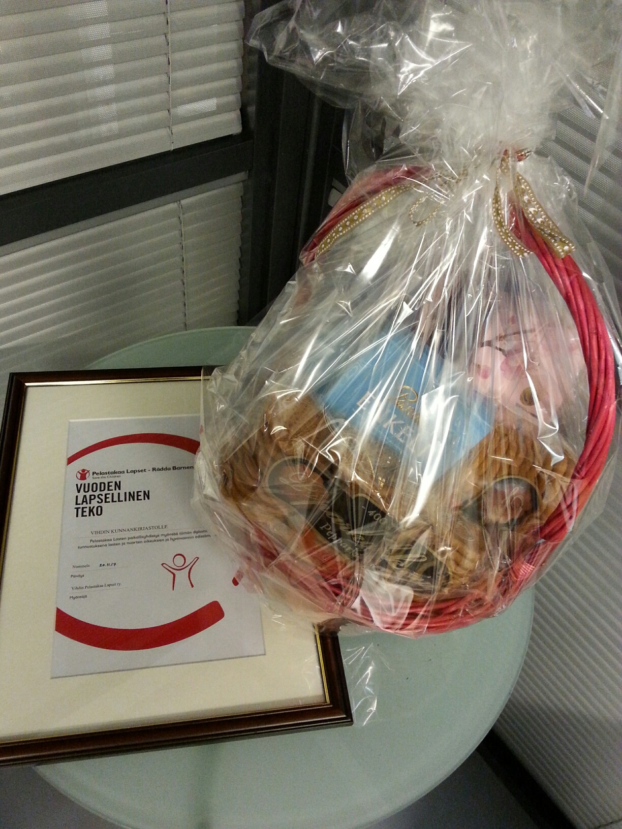 Vihdin Pelastakaa lapset ry luovutti Lapsen oikeuksien päivänä 20.11.2017 ensimmäistä kertaa Vuoden lapsellinen teko –kunniakirjan Vihdin kunnankirjastolle.