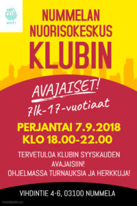 Nummelan nuorisokeskus Klubin syyskauden avajaiset pe 7.9.2018