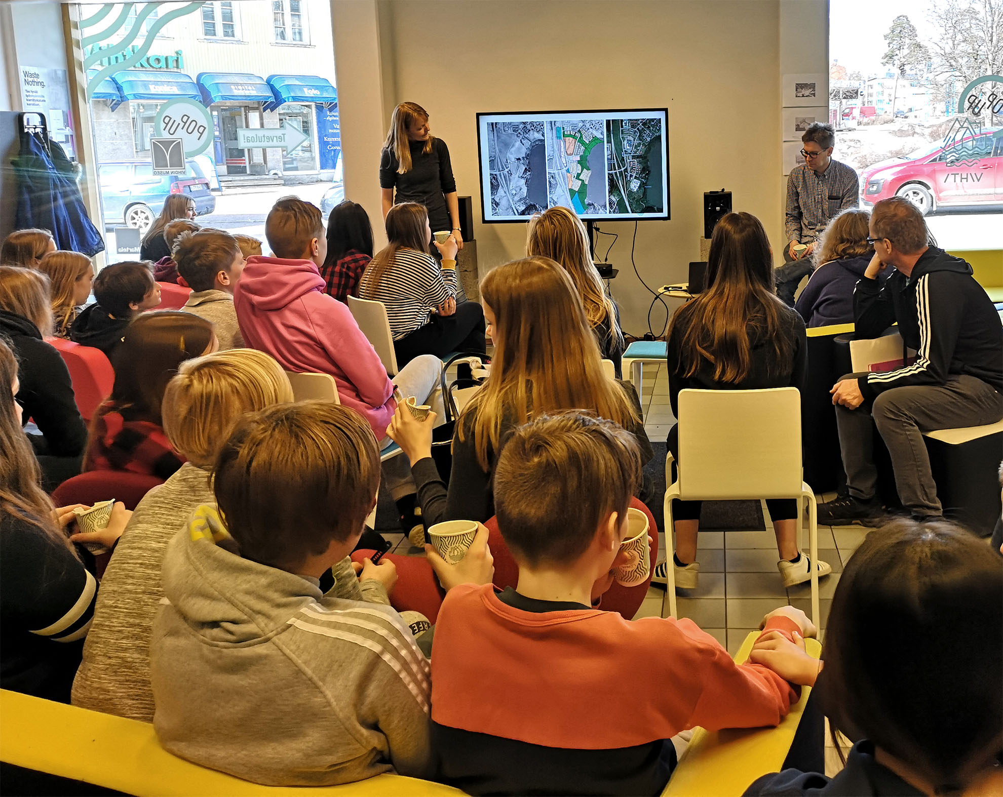 Vihdin kunnan kaavasuunnittelijat järjestivät kaavoitusaiheisen esittelytilaisuuden Kuoppanummen koulukeskuksen oppilaille torstaina 28.3.2019. Oppilaat olivat 5- ja 7-luokkalaisia. Tilaisuudessa hyödynnettiin kunnan käytössä olevaa, ns. Auran talon, PopUp –tilaa osoitteessa Asemantie 1, Nummelassa.