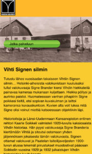 Vihdin museo kunnioittaa 15. huhtikuuta vietettyä Signen syntymän 150-vuotismerkkipäivää julkaisemalla mobiilioppaan Vihti Signen silmin. Opas esittelee Signen ja otoksen hänen 1920- ja -30-lukujen taitteessa ottamiaan Vihti-aiheisia valokuvia. Kuvat on esitelty nimenomaan kuvaajan näkökulmasta. Kuvien alta voit lukea mitä Signe olisi voinut miettiä katsoessaan objektiivin läpi. Mobiilioppaasta näet myös kuvauskohteiden sijainnin. Suuret kiitokset Signelle! Kuvasi ovat upeita helmiä Vihdin historiasta! Mobiilioppaaseen voit tutustua osoitteessa tarinasoitin.fi/vihtisignensilmin.