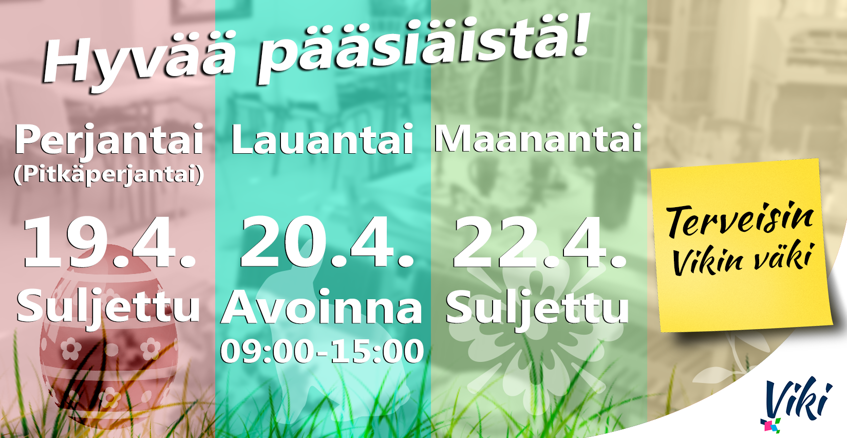 Oikein hyvää pääsiäistä kaikille! Olemme kiinni pitkäperjantaina 19.4. ja lauantaina olemme avoinna 09:00 – 15:00. Olemme myös seuraavan maanantain kiinni 22.4. päivä. Sen jälkeen olemme normaalisti loppukuun auki.
