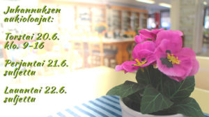 Oikein hyvää juhannusta kaikille! Olemme torstaina 20.6. avoinna 09:00 – 16:00. Juhannusaaton 21.6. sekä juhannuspäivän 22.6. olemme kiinni.