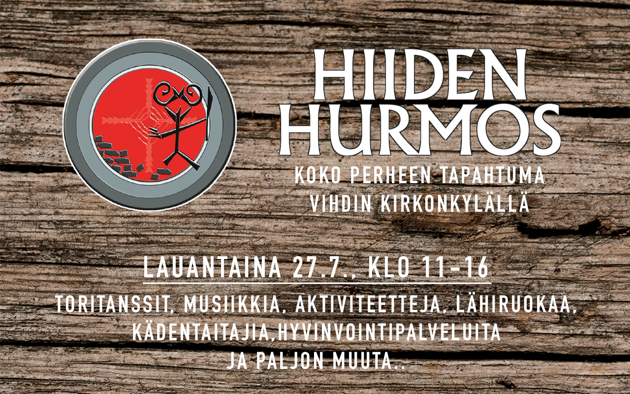 Heinäkuun viimeisenä lauantaina 27.7. järjestettävä Hiiden Hurmos tarjoaa Vihdin kirkonkylän torialueella monenlaista ohjelmaa, musiikkia ja paikallisten yrittäjien tuotteita. Tapahtuma alkaa kello 11.00 ja jatkuu kello 16.00 asti ja on kaikille avoin ja maksuton.
