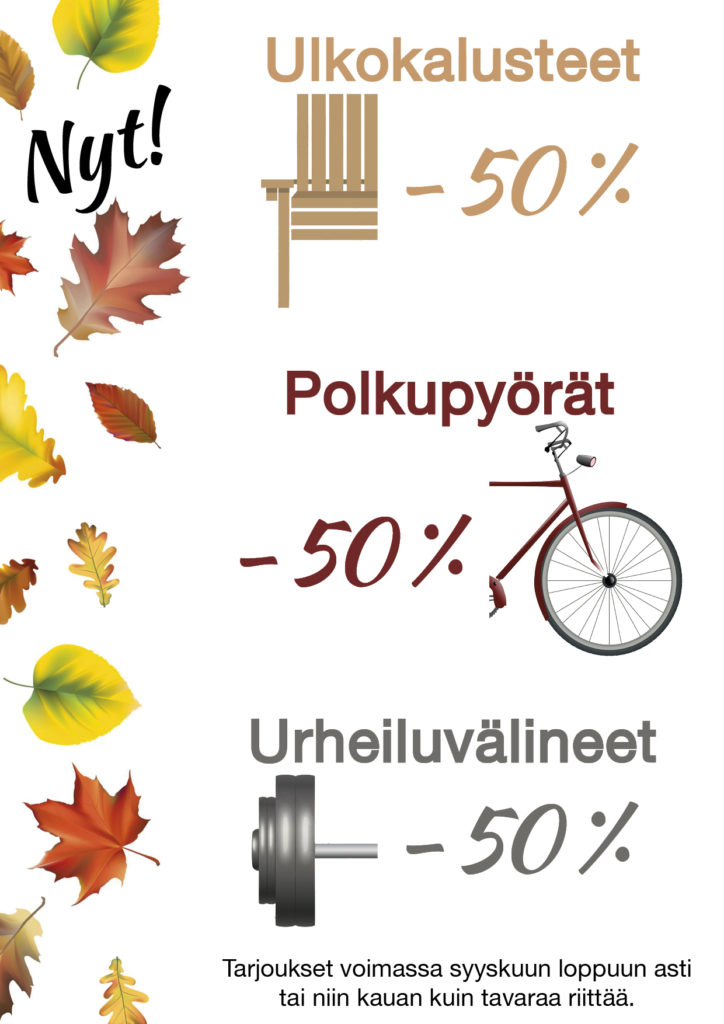 Syyskuun loppua vietetään sesonkialennuksin! Ulkokalusteet, polkupyörät ja urheiluvarusteet myydään nyt -50%. Tarjous on voimassa syyskuun loppuun tai niin kauan kuin tavaraa riittää.