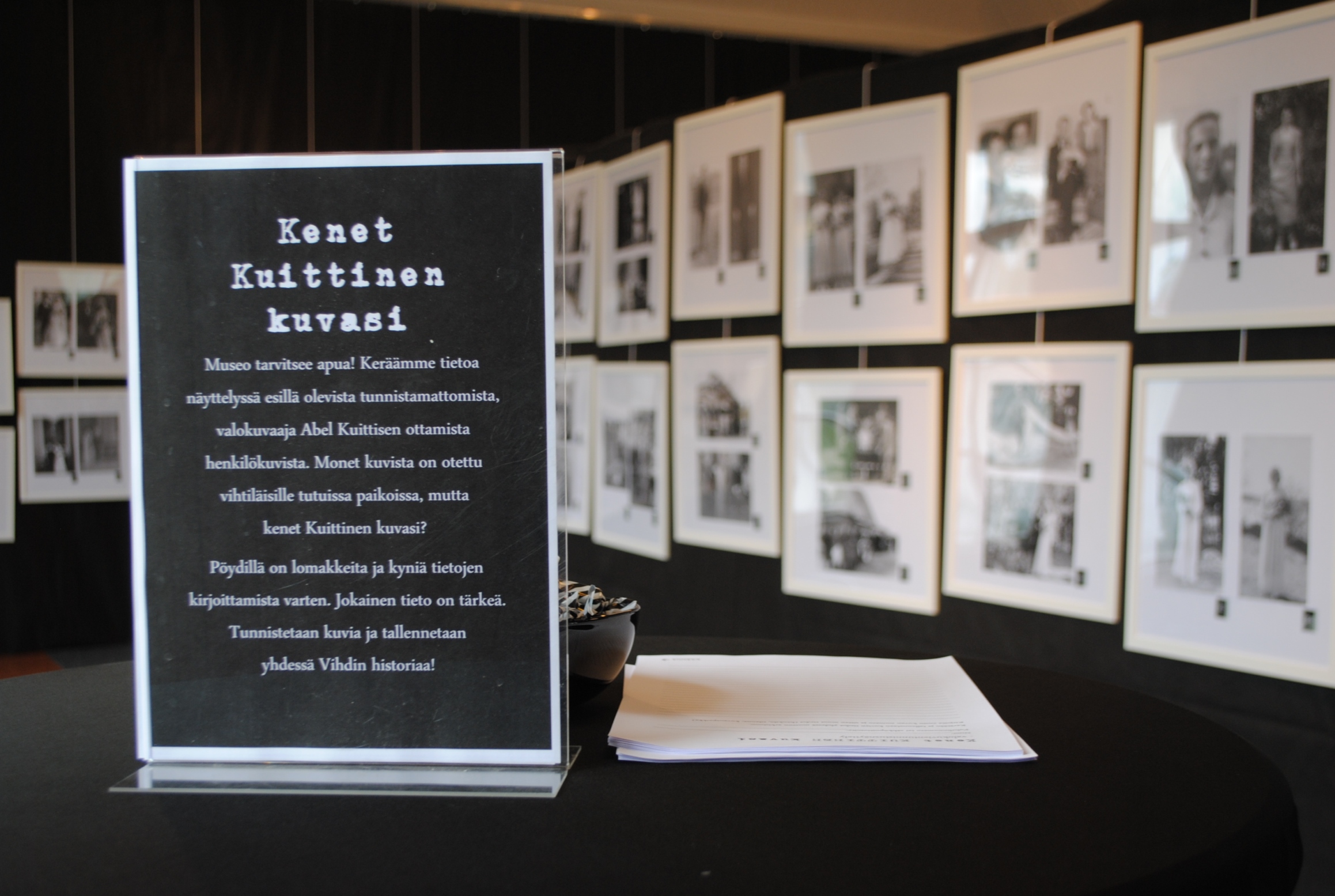 Abel Kuittinen syntyi Liperissä vuonna 1888 ja kuoli Vihdissä vuonna 1976. Vihdin museon kokoelmiin on talletettu yli 1000 hänen ottamaansa valokuvaa 1930-luvulta 1960-luvulle. Mutta keitä ovat henkilöt Kuittisen ottamissa valokuvissa? Kenet Kuittinen kuvasi -valokuvien tunnistusnäyttelyssä on esillä noin 150 hänen ottamaansa valokuvaa, joiden henkilöistä museolla ei ole tietoa. Tunnistetaan kuvia ja tallennetaan yhdessä Vihdin historiaa.