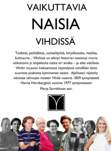 Pääkirjastolla Nummelassa voi tutustua lokakuun ajan kymmeneen vihtiläiseen vaikuttajanaiseen vuonna 1859 syntyneestä Hanna Hernbergistä vuonna 1977 syntyneeseen Marja Sannikkaan. Näyttely liittyy Zonta-järjestön 100-vuotisjuhlavuoteen ja on toteutettu yhteistyössä Hiidenveden Zonta-kerhon ja Vihdin kuvataidekoulun kanssa.