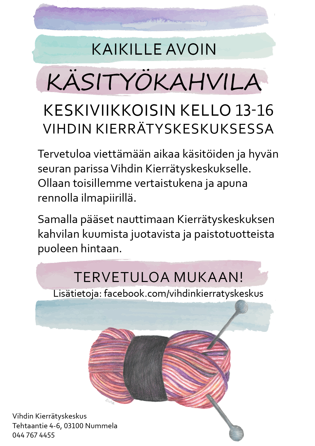 Vihdin Kierrätyskeskuksessa pyörähtää käyntiin käsityökahvila. Halukkaat voivat kokoontua keskiviikkoisin 13-16 hyvän seuran ja vertaistuen merkeissä. Samalla voi nauttia kahvilan lämpimistä juomista ja paistotuotteista puoleen hintaan. Käsityökahvila pyörii alustavasti syksyn ajan ja Facebook-sivuillamme tiedotetaan mahdollisista poikkeuksista ja jatkosta.