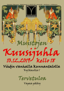 Vihdin museo kutsuu kaikki vihtiläiset muistojen kuusijuhlaan. Juhlitaan saapuvaa joulua yhdessä 1950-luvun kansakoulun kuusijuhlan hengessä. Tilaisuudessa on luvassa perinteistä lasten esittämää joulujuhlaohjelmaa, yhteislaulua ja taidetaanpa juhlaan saada toivottu vieras kaukaa Korvatunturilta asti – aikakauden hengessä tottakai!