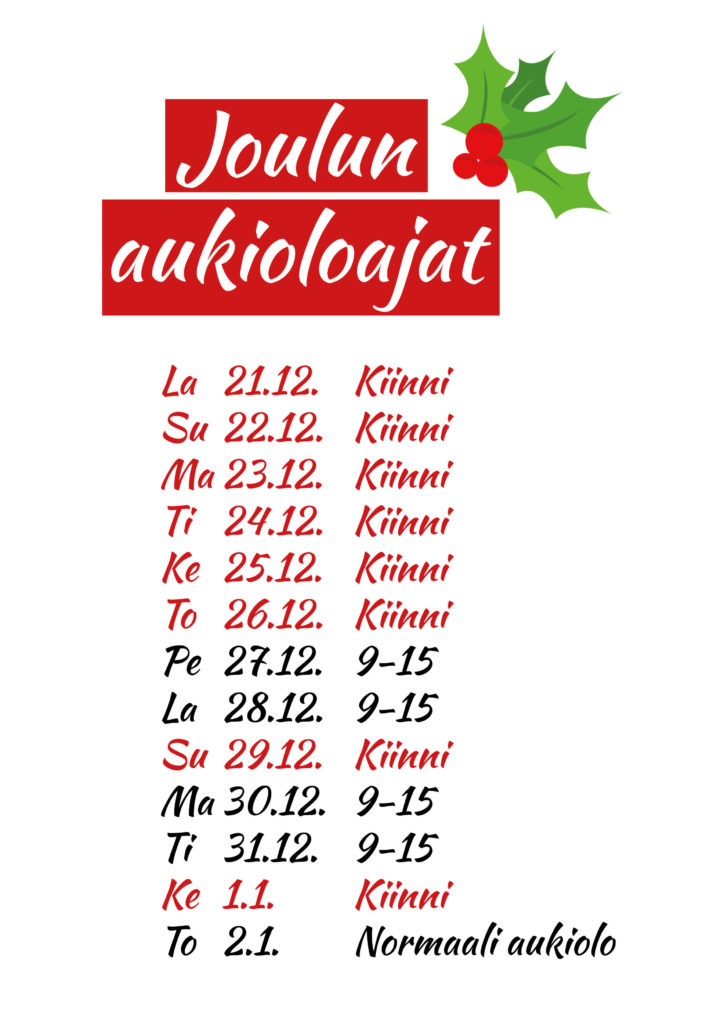 Joulu lähestyy kovaa vauhtia ja ViKissäkin on koittanut viimeiset päivät ennen lomia. Työntouhun lomassa iskettiin joulutavarat 50 % alennukseen, mutta huomaathan, että olemme auki vain perjantaihin. Myös kirja-alennus, kirja kaupan päälle yli 1 € ostoksista, on vielä voimassa perjantaihin asti. Perjantaina sanomme heipat muutamaksi päiväksi ja toivotamme teille hyvää joulua tarjoamalla glögiä ja pipareita.