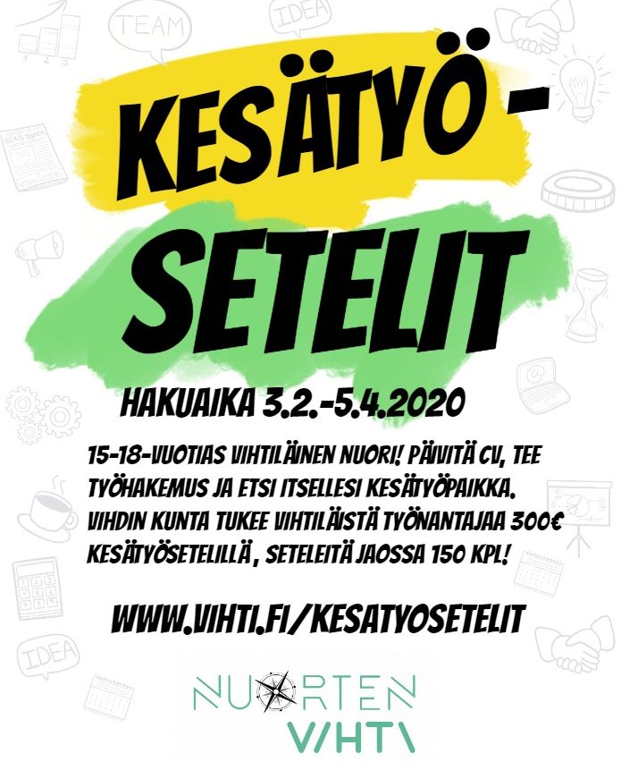 Vihdin kunta myöntää jälleen 150 kesätyöseteliä 15-18 -vuotiaille (2002-2005 -syntyneille) vihtiläisille nuorille kesällä 2020. Vihdin kunta korvaa 300 euroa kesätyösetelillä työllistetyn nuoren palkasta.