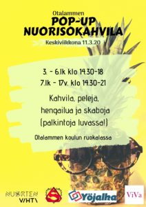 Kevään toinen pop-up nuorisokahvila järjestetään Otalammen koulun ruokalassa keskiviikkona 11.3. Pop-up nuokkarilla on mahdollisuus erilaisiin aktiviteetteihin mm. konsoli- ja lautapelien pelaamiseen sekä kahvila, josta voi ostaa pientä syötävää ja juotavaa (käteismaksu). Pop-up nuokkarille voi tulla myös viettämään muuten vain aikaa tai juttelemaan nuorisotyöntekijöiden kanssa. Nuorisopalveluiden lisäksi paikalla on väkeä Sankarlasta, Yöjalasta sekä Vihdin vanhemmista.