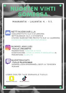 Nuorten Vihti toimii somekanavilla maanantaista torstaihin klo 8 – 20, perjantaisin klo 8 – 21 sekä lauantaisin klo 13 – 21. Voit myös pyytää ohjaajia pelaamaan sun kanssa aina, kun olemme linjoilla. Ota meihin yhteyttä missä tahansa somekanavassa tai WhatsAppin kautta!