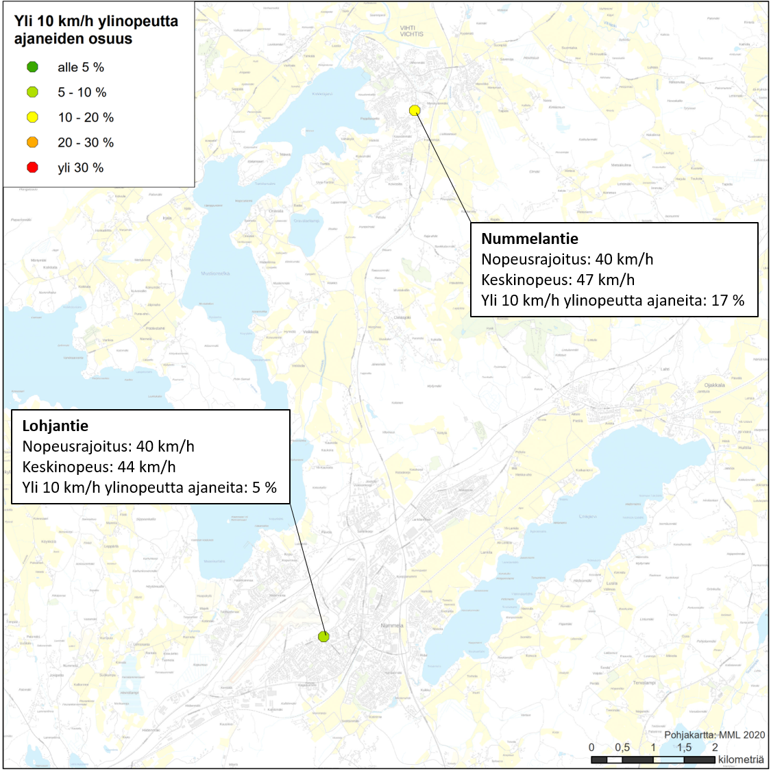 Kunnan kiinteät näytöt Lohjantiellä (Väinämöisentien kohdalla) ja Nummelantiellä (Myrskylänkujan kohdalla) sijaitsevat 40 km/h nopeusrajoitusalueella. Tammikuussa 2020 suurin osa autoilijoista ylitti nopeusrajoituksen kummassakin kohteessa. Selkeitä, yli 10 km/h nopeusrajoituksen ylittäneitä oli Lohjantiellä 5 % ja Nummelantiellä 17 %. Kummassakin kohteessa on suora tieosuus, mikä selittää osaltaan korkeita nopeustasoja. Näytöt muistuttavatkin näissä kohteissa autoilijoita hiljentämään ajonopeuttaan.