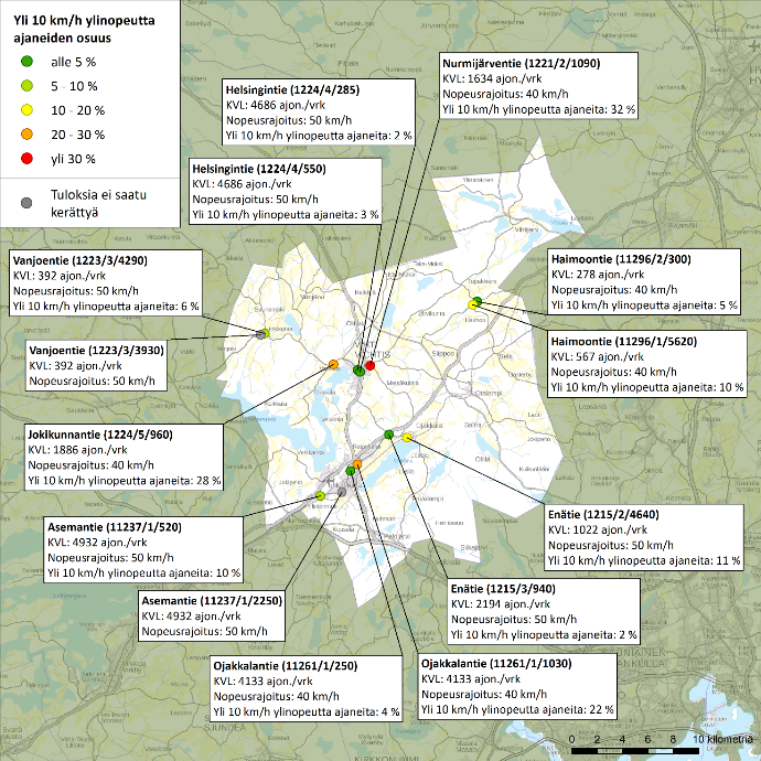 Eniten ylinopeuksia ELY-keskuksen Vihdin nopeusnäyttökohteissa mitattiin Nurmijärventiellä (sisääntuloväylä), Jokikunnantiellä (sisääntuloväylä) ja Ojakkalantiellä (saarekkeettomia suojateitä ja päiväkoti lähellä). Yhtenä selittävä tekijänä Nurmijärventien ja Jokikunnantien kohteissa voidaan pitää näytön sijaintia melko lähellä nopeusrajoituksen muuttumiskohtaa, jolloin nopeustasot eivät olleet ehtineet näytön kohdalla vielä laskea nopeusrajoituksen tasolle. Näytön ensisijainen tehtävä olikin siten toimia muistuttajana nopeusrajoituksen muuttumisesta ja herättää autoilija huomioimaan oma tilanteeseen liian korkea ajonopeus.