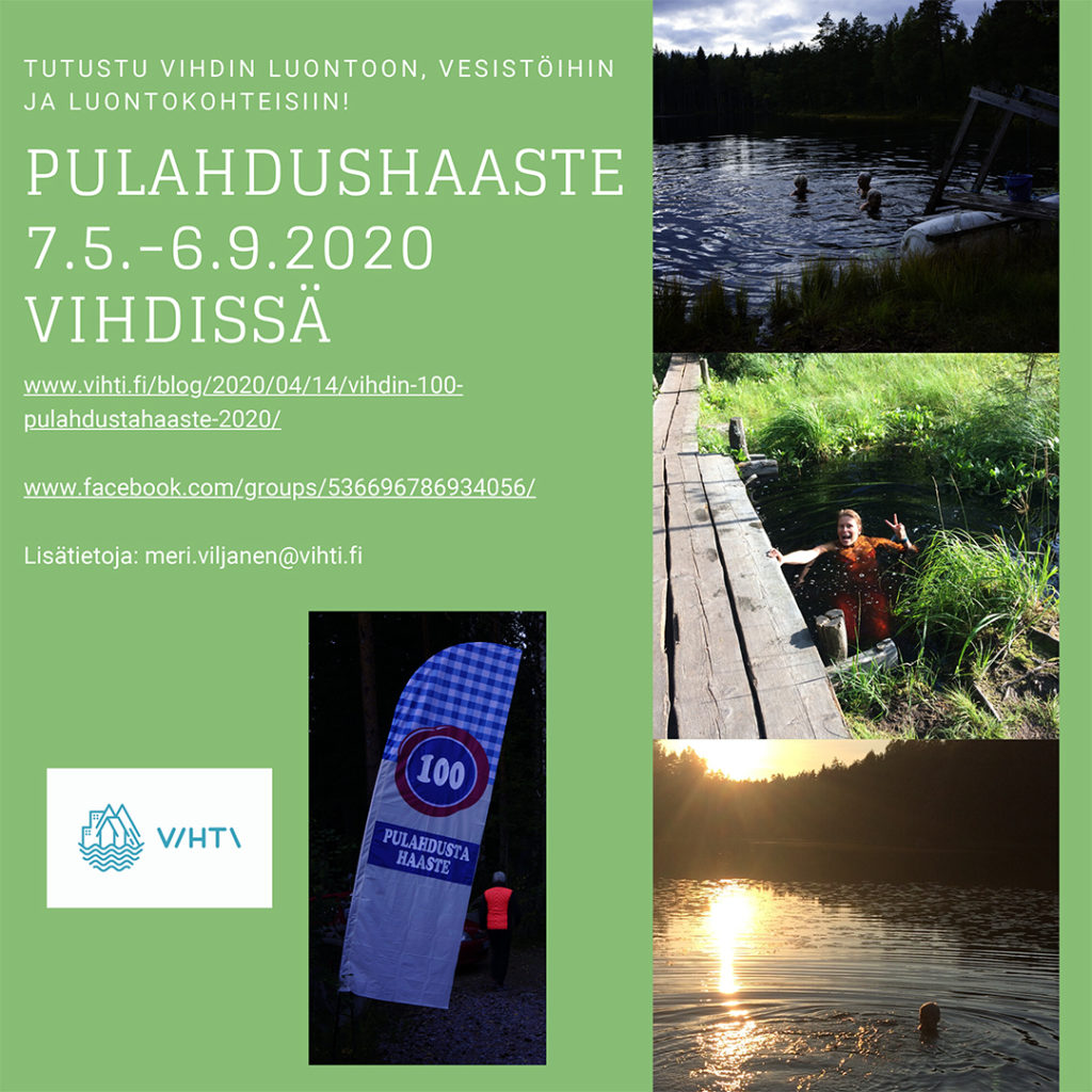 Vihdin liikuntapalvelut järjestävät nyt toista kertaa Vihdin 100 pulahdusta -haasteen. Pulahdushaaste on käynnissä 7. toukokuuta – 6. syyskuuta. Haaste alkaa Uusimaa-viikon torstaina, jolloin teemana on hyvinvointi. Haasteeseen osallistuvien tavoitteena on käydä uimassa sata kertaa eri vesistökohteissa.