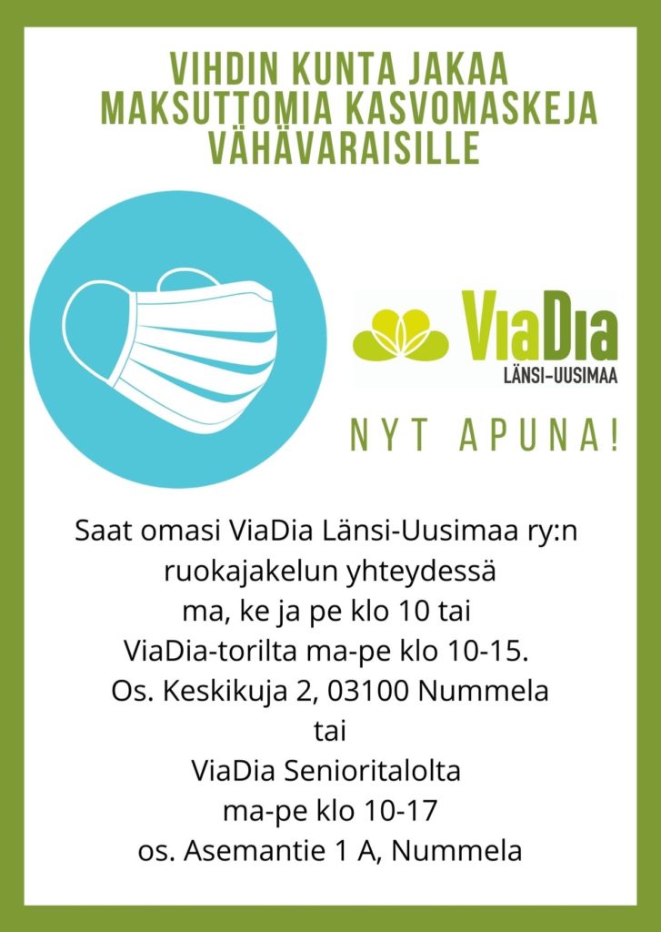 ViaDialta – ruokajakelun yhteydessä ma, ke ja pe klo 10 tai ViaDia-torilta ma-pe klo 10-15 (Keskikuja 2, Nummela) tai ViaDia Senioritalolta ma-pe klo 10-17 (Asemantie 1 A, Nummela).