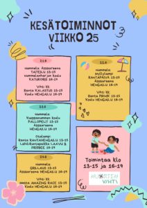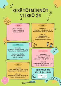 Nuorisopalvelut järjestää kesätoimintaa viikoilla 25 ja 26 eri puolilla Vihtiä. Toimintapäivinä on ohjelmassa mm. taiteilua, liikuntaa, grillausta sekä mukavaa yhdessäoloa. Alta näet tarkemmat paikat ja ajankohdat molempien viikkojen kesätoiminnoista.