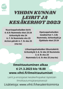 Vihdin kunnan nuoriso-, liikunta- ja opetuspalvelut ovat suunnitelleen jälleen mukavaa kesätoimintaa tulevalle kesälle. Päiväleirit ja kesäkerhot tarjoavat turvallisen, sosiaalisia suhteita vahvistavan mahdollisuuden viettää kesälomaa ammattitaitoisten ohjaajien seurassa. Viime kesän palautteissa kiiteltiin monipuolista ohjelmaa, mukavia ohjaajia, kohtaamisen taitoa ja sitä, että lapsi nähtiin yksilönä.