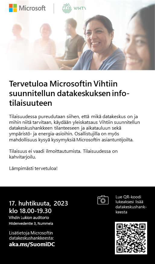 Tervetuloa Microsoftin Vihtiin suunnitellun datakeskuksen tilaisuuteen 17.4. klo 18. Vihdin lukion auditoriolle.