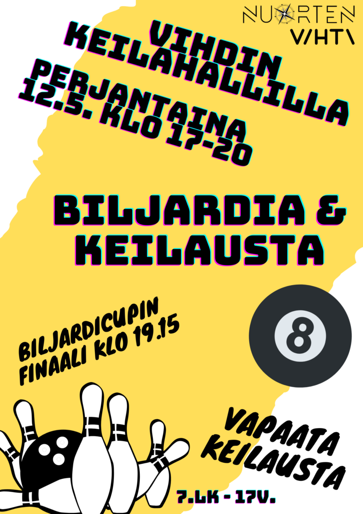 Nuorisopalvelut järjestää jo kolmannen kerran biljardi- ja keilaustapahtuman Nummelan keilahallilla perjantaina 12.5.2023. Iltaan voi osallistua biljardin ja keilauksen merkeissä tai ihan muuten vain aikaa viettäen ja jutustellen ohjaajien kanssa. Toiminta on suunnattu 7. luokkalaisista 17-vuotiaisiin. Päivän aikana nuorisotilat Mesta ja Nurkka ovat kiinni. Toiminta alkaa klo 17.00 ja päättyy klo 20.00