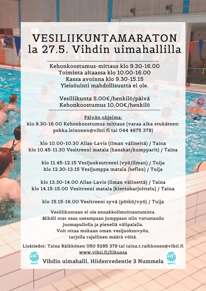 Vesiliikuntamaraton valloittaa Vihdin uimahallin lauantaina 27.5. Tarjolla on monipuolisesti erilaisia jumppia vedessä. Vesiliikuntaan ei tarvitse ilmoittautua etukäteen. Lisäksi sinun on mahdollista tehdä kehonkoostumusmittaus, muista varata paikkasi etukäteen.