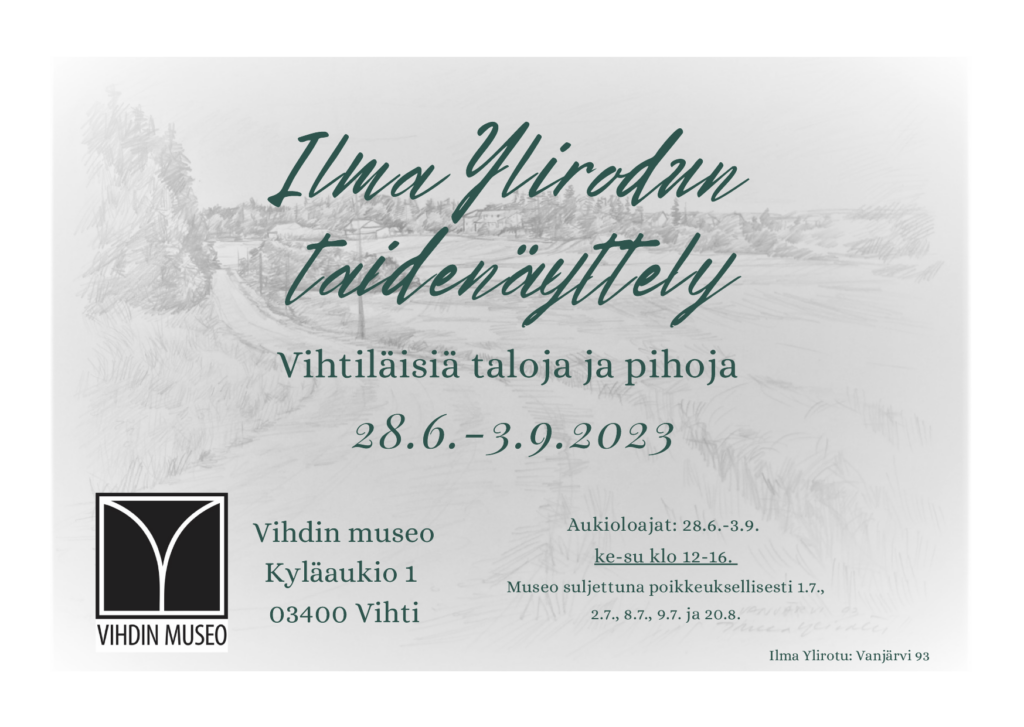 Vihdin museon juhlasalissa on esillä taidegraafikko Ilma Ylirodun näyttely Vihtiläisiä taloja ja pihoja. Näyttely on auki museon aukioloaikojen mukaan 3.9. saakka.