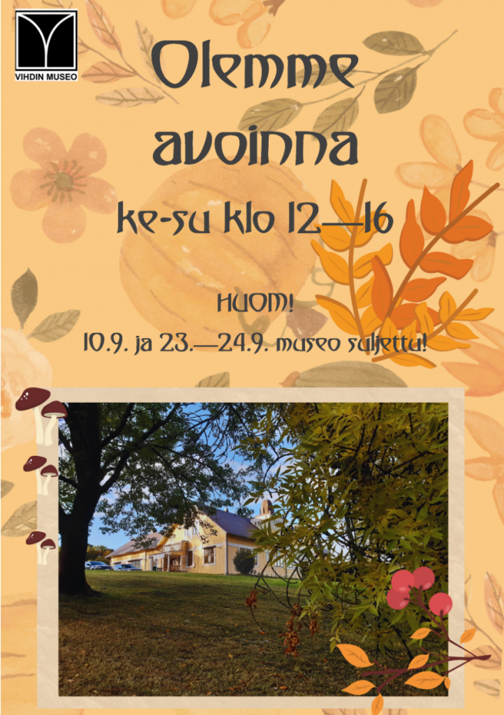Museo on syyskuussa auki ke-su klo 12-16 paitsi sunnuntaita 10.9. ja la-su 23.-24.9.