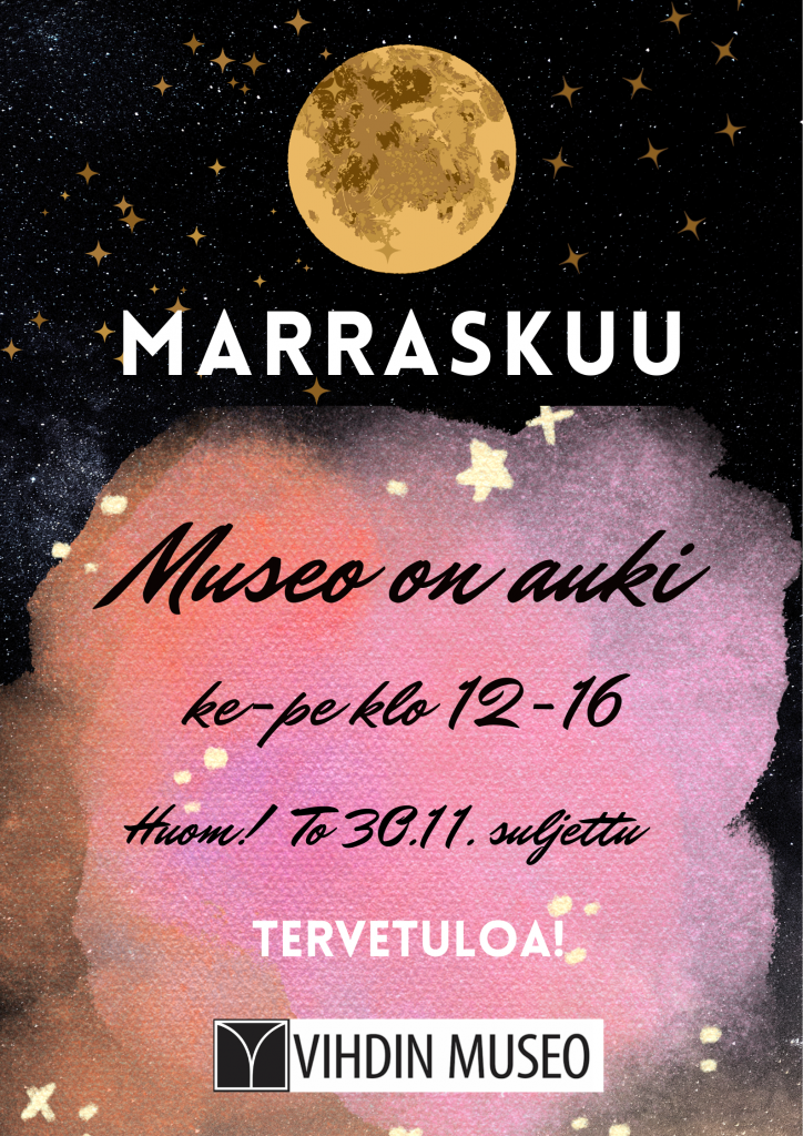 - pe 24.11. Vihdin kirkonkylän joulunavaus, museo on auki klo 20.00 saakka
