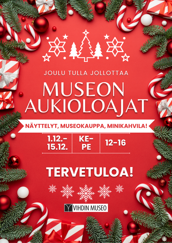 Museo on joulukuussa auki ke-pe klo 12-16 (HUOM! suljettu ke 6.12.) perjantaihin 15.12. saakka, jolloin museon ovet sulkeutuvat yleisöltä. Sen jälkeen tapaamme jälleen tammikuussa!
