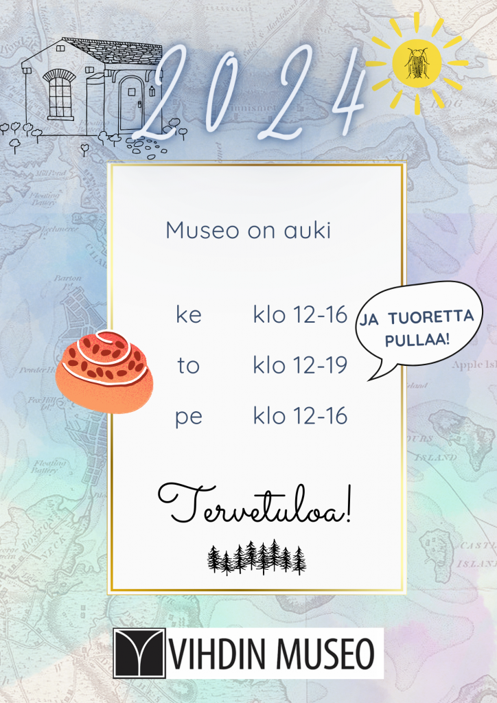 Vihdin museo aloittaa vuoden 2024 pienellä aukioloaikojen uudistuksella. Joulutauon jälkeen museon ovet avautuvat keskiviikkona 10.1. ja museo on tuttuun tapaan auki keskiviikkoisin ja perjantaisin klo 12-16. Uudistus koskee torstai-päiviä, jolloin museossa voi viipyä klo 19 saakka! Torstaisin museokahvilassa on myös mahdollista ostaa tuoretta pullaa.