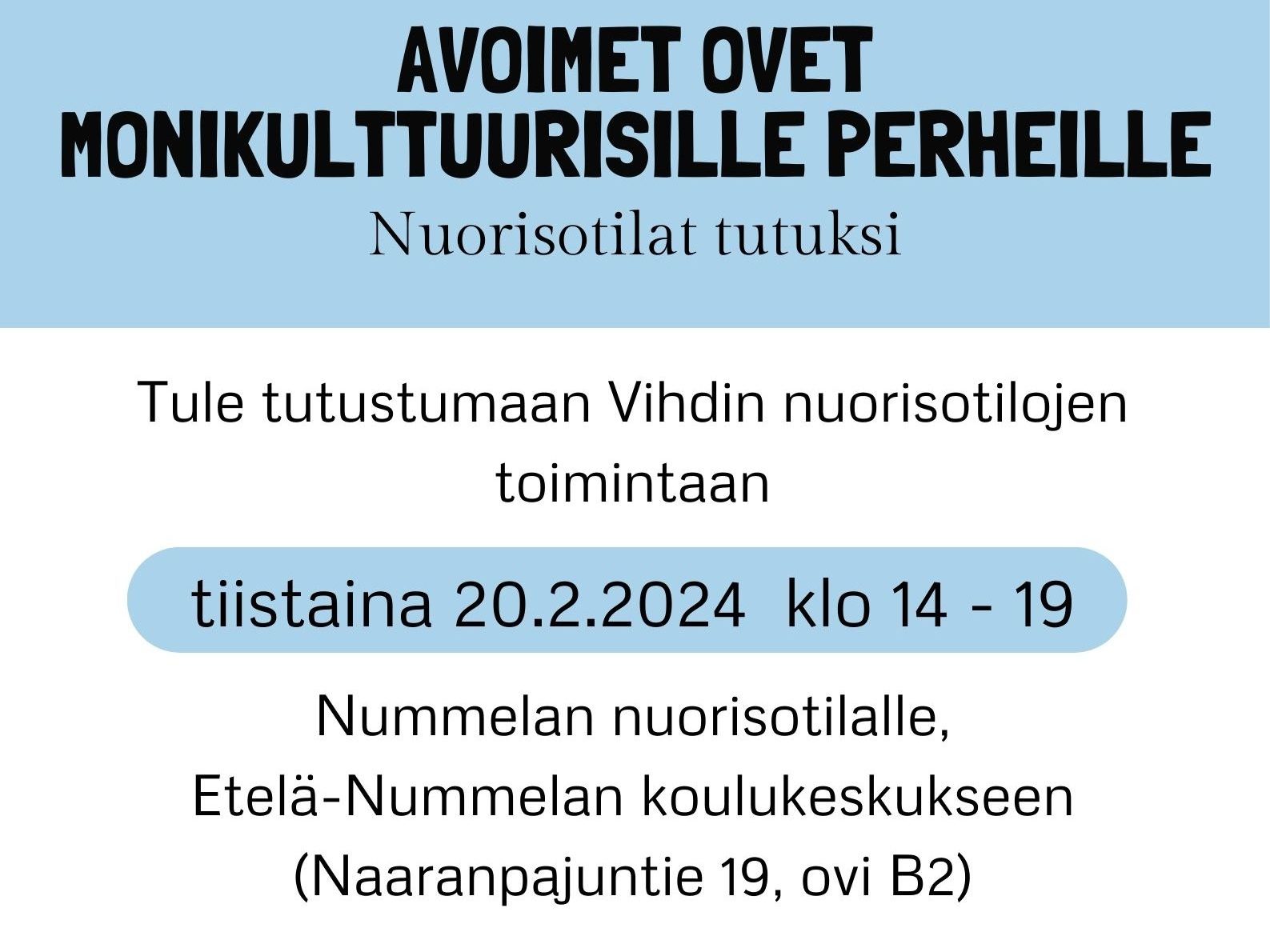 Nummelan nuorisotilalla järjestetään tiistaina avoimet ovet monikulttuurisille perheille. Avointen ovien aikana on mahdollisuus tutustua Vihdin nuorisotilojen toimintaan. Tarkemmat tiedot tapahtumasta voit lukea tästä linkistä: Nuorisotilat tutuksi – Avoimet ovet monikulttuurisille perheille.
