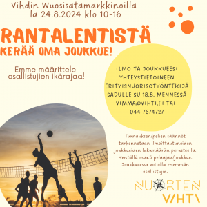 Nyt on mahdollisuus kerätä oma joukkue ja tulla yhdessä pelaamaan rantalentistä Wuosisatamarkkinoilla la 24.8. klo 10-16. Emme määrittele osallistujien ikärajaa, pelaavat voivat olla nuoria, lapsia tai aikuisia. Pelaajia voi olla kentällä max.5/joukkue, mutta joukkueessa voi olla osallistujia myös enemmän.