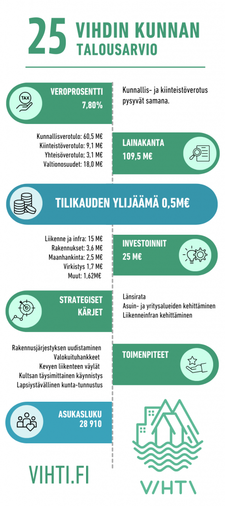 Vihdin kunnanjohtaja Erkki Eerola esitteli vuoden 2025 talousarvioesityksen, joka on lähes 0,5 miljoonaa euroa ylijäämäinen. Kunnallisveroprosentti tulevalle vuodelle pysyy ennallaan ja on 7,80 %. Ennakoitu kunnallisveron kokonaismäärä on 60,5 miljoonaa euroa, mikä on 3,3 miljoonaa euroa enemmän kuin vuonna 2024. Kiinteistöverotus pysyy myös samana, ja ennakoidut kiinteistöverotulot ovat 9,1 miljoonaa euroa, mikä on 0,4 miljoonaa euroa enemmän kuin edellisvuonna. Vuoden 2025 lainakanta on arvioitu olevan 109,5 miljoonaa euroa.