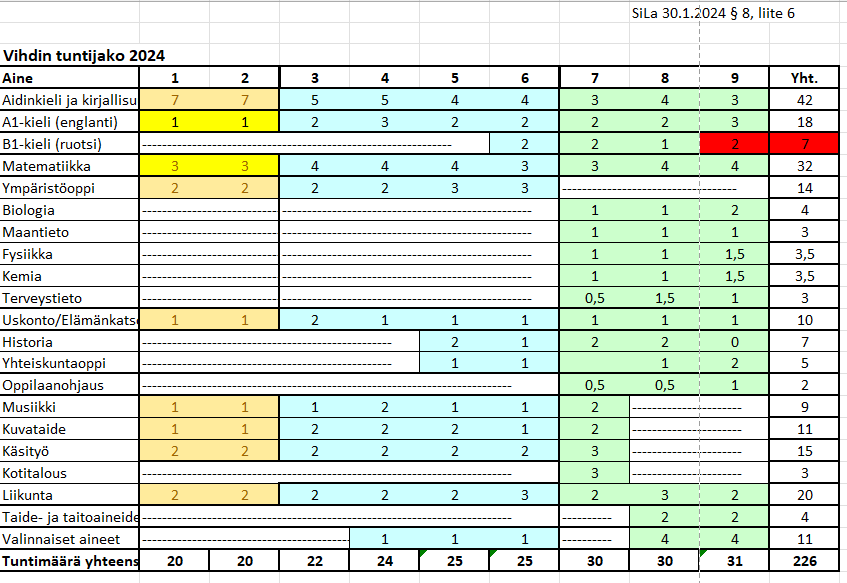 Valtioneuvoston asetuksessa säädetyt tavoitteet ohjaavat tarkastelemaan opetusta kokonaisuutena, joka rakentaa tässä ajassa tarvittavaa yleissivistystä ja luo pohjaa elinikäiselle oppimiselle. Tiedonalakohtaisen osaamisen lisäksi tulee tavoitella oppiainerajat ylittävää osaamista ja taitoja. Tähän pohjautuen opetussuunnitelman perusteissa määritellään tavoitteet ja sisällöt sekä yhteisille oppiaineille että tavoitteet oppiaineita yhdistäville laaja-alaisille osaamisalueille ja monialaisille oppimiskokonaisuuksille. Tavoitteiden toteutuminen Vihdissä edellyttää suunnitelmallista yhteistyötä ja tavoitteiden toteutumisen arviointia.
