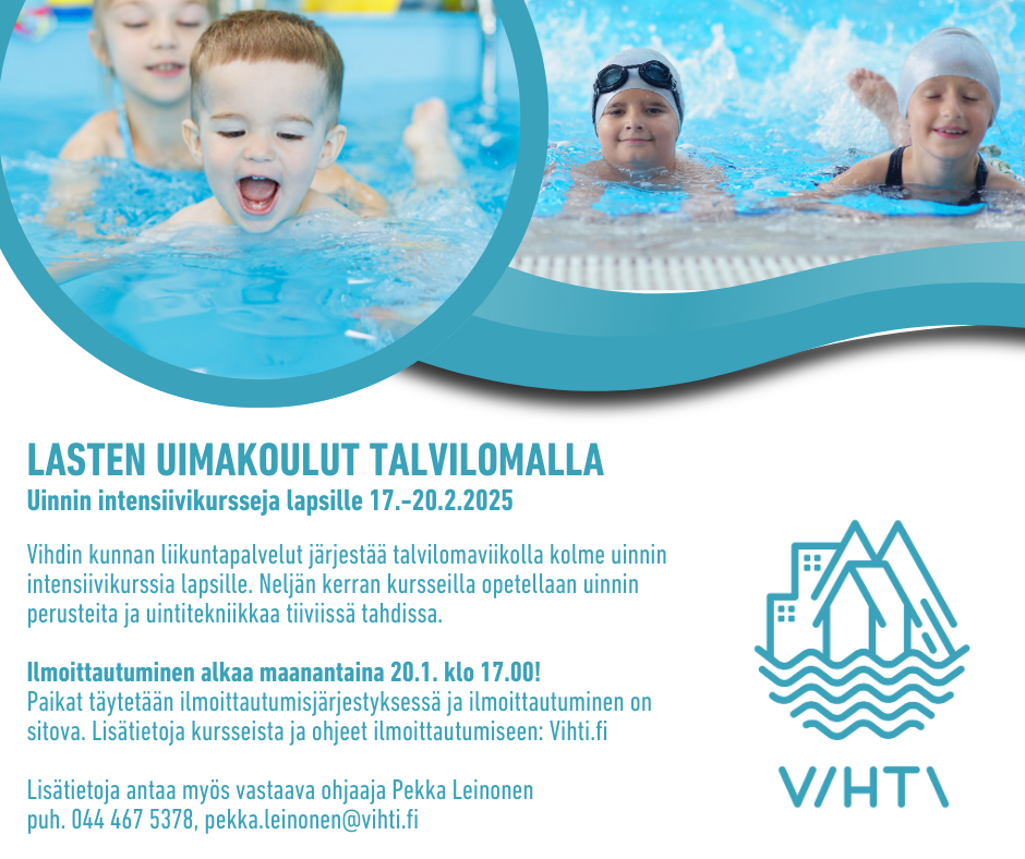 Vihdin kunnan liikuntapalvelut järjestää talvilomalla kolme uinnin intensiivikurssia lapsille. Neljän kerran kursseilla opetellaan uinnin perusteita ja uintitekniikkaa tiiviissä tahdissa. Lue lisää.