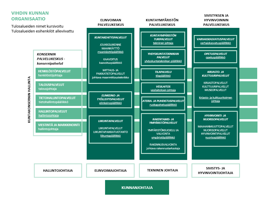 Kunnan palvelukeskukset ovat elinvoimapalvelut, konsernipalvelut, sivistys- hyvinvointipalvelut sekä kuntaympäristöpalvelut.